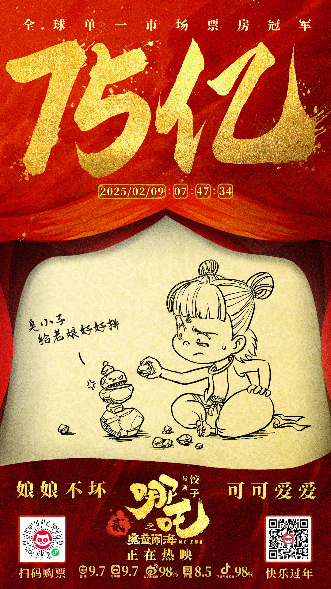 影片《哪吒之魔童闹海》票房突破75亿。
